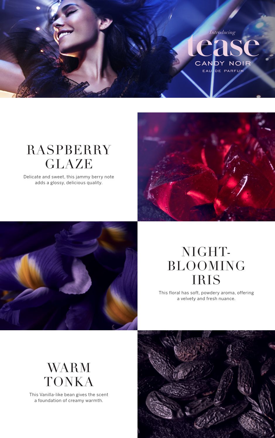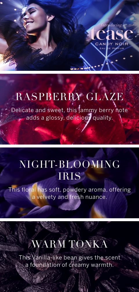 Wrap yourself in your favorite fragrance. Our fast-absorbing, skin-nourishing lotion adds the perfect touch of scent. Wild and free, Tease Candy Noir is a dark fusion of glossy berries and weightless warmth.